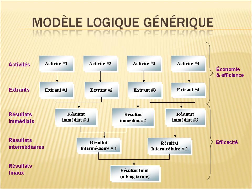 L'évaluation exige une compréhension approfondie de la théorie d'intervention de chaque initiative. Cette compréhension se fonde normalement sur l'élaboration d'un modèle logique (voir l'exemple ci-après) qui clarifie la stratégie d'ensemble (et les postulats ou hypothèses) sur laquelle repose l'approche utilisée par la politique, le programme ou l'initiative.